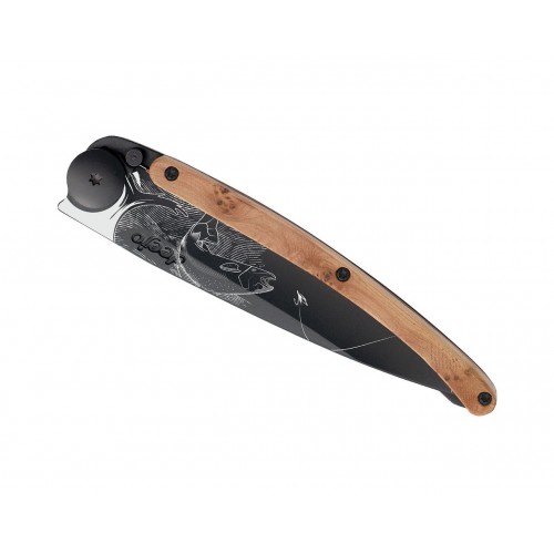 Optez pour ce couteau de poche deejo au design original, et à la qualité remarquable. Ce couteau ultra-léger est en acier inoxydable Z40C13, finition titane noir. La lame est décorée d'une fine gravure de truite, mise en valeur par la profonde finition authracite de la lame. Le manche est décoré d'une plaquette en loupe de genévrier. .Le genévrier est un bois naturellement odorant, dont se dégage un parfum légèrement poivré. Tout en arabesque de beiges, chaque plaquette, finement nervurée, fait de votre Deejo une pièce unique et précieuse.
