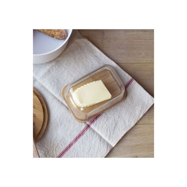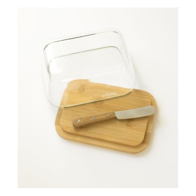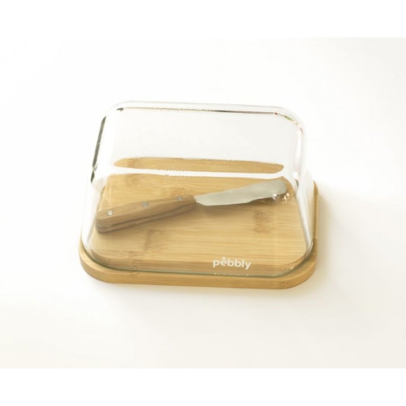 Découvrez ce beurrier en bambou et verre avec couteau à beurre.