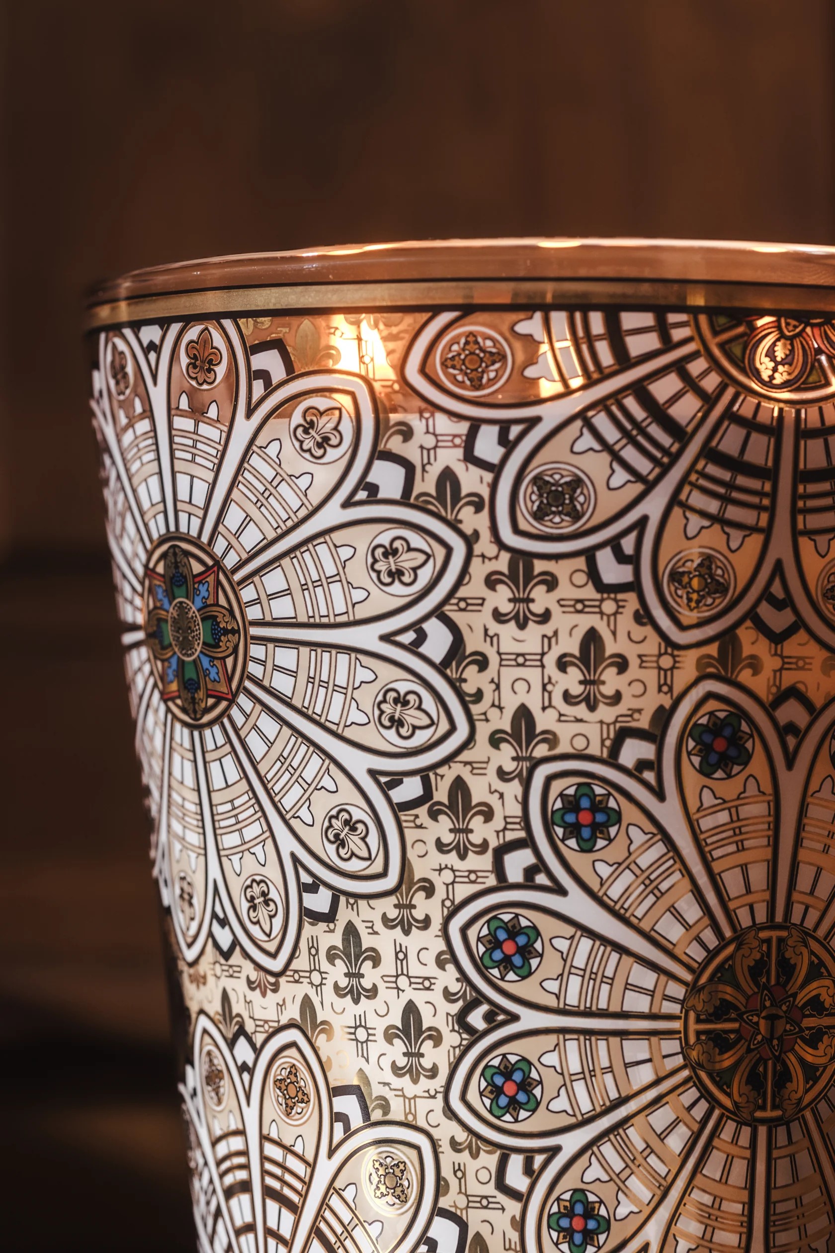 Son verre est recouvert d’une sérigraphie précieuse, où l’or et les couleurs subtiles dessinent des motifs inspirés des rosaces médiévales.