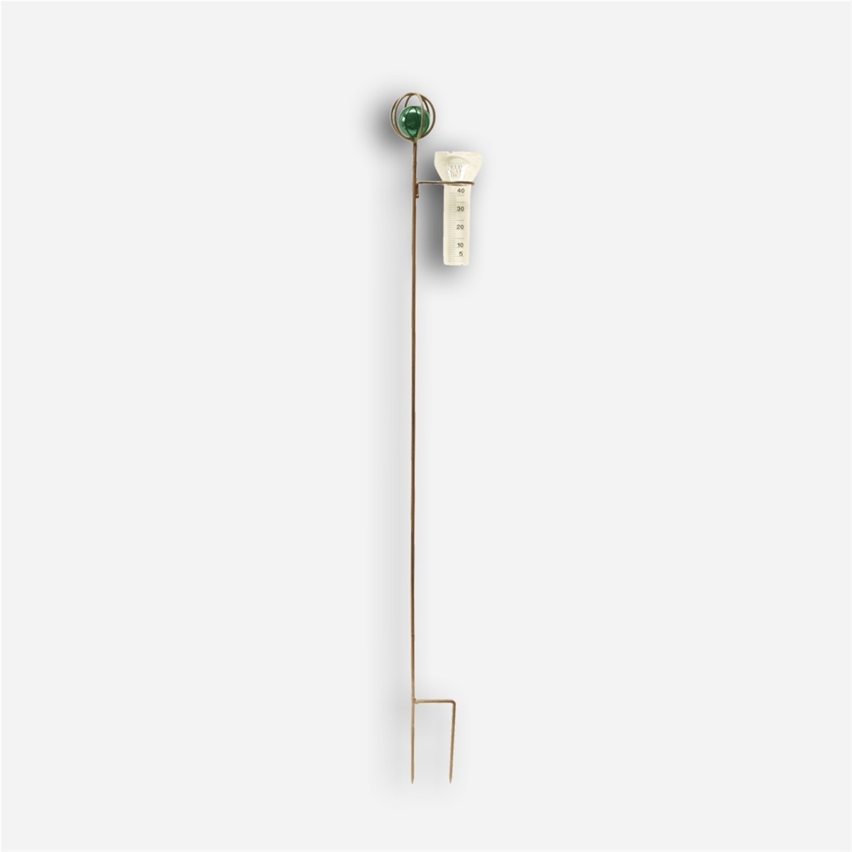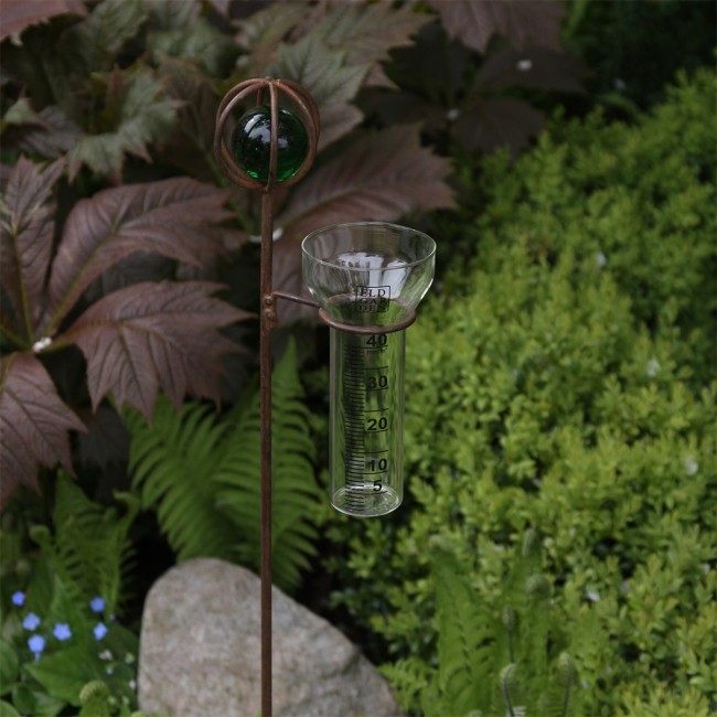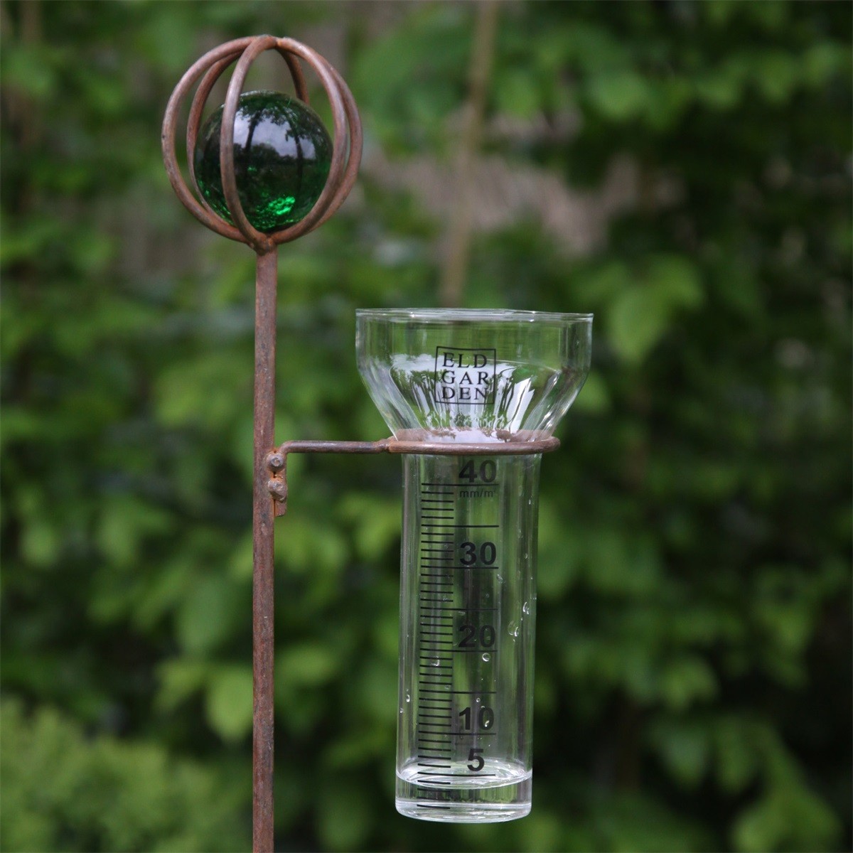 Le pluviomètre Korn est un produit phare d'ELDgarden. Sa boule de verre verte contraste élégamment avec sa couleur rouille.