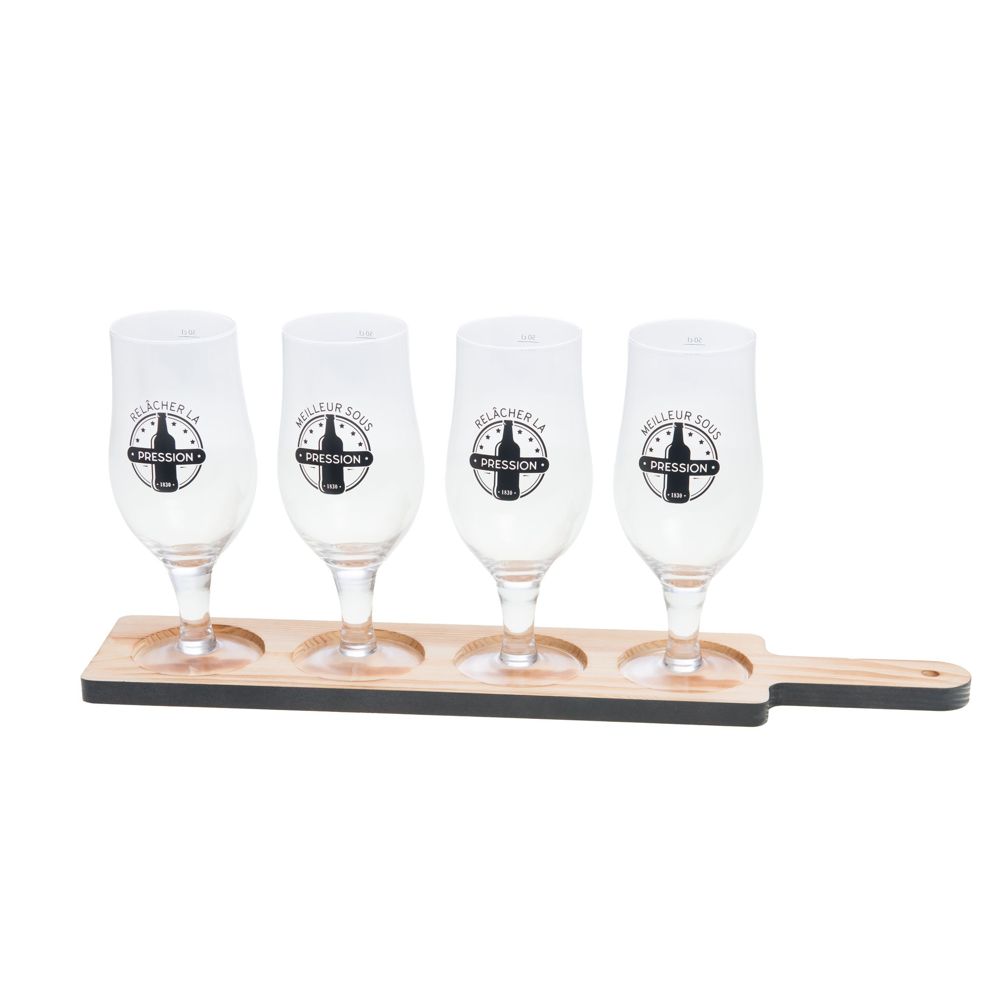 Set dégustation composé d'une planche en bois avec poignée et de 4 verres à pression en verre borosilicate :