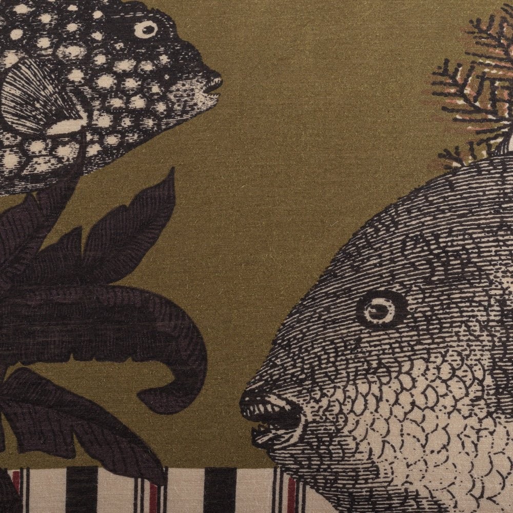 Pile ou face ? Le coussin Fish est un malin. Avec ses poissons à l’avant et un imprimé géométrique à l’arrière, vous pourrez le disposer recto/verso au gré de vos envies. Il aime se mélanger avec nos autres coussins Bestiaires et la collection Goa pompons en velours de soie pour sublimer les matières.