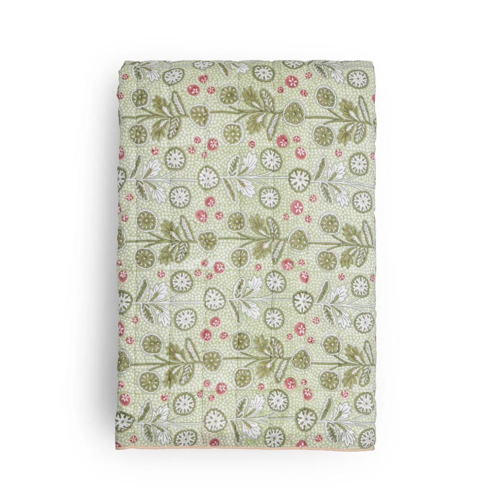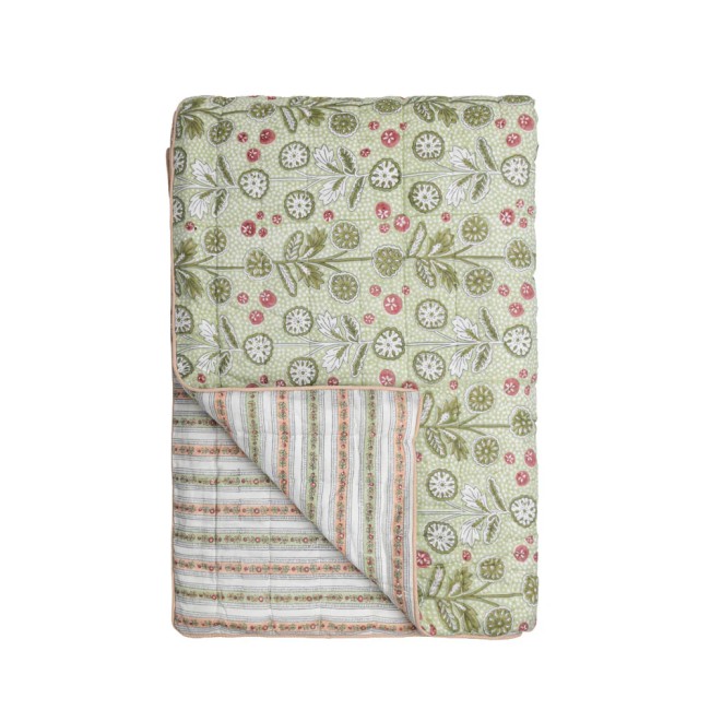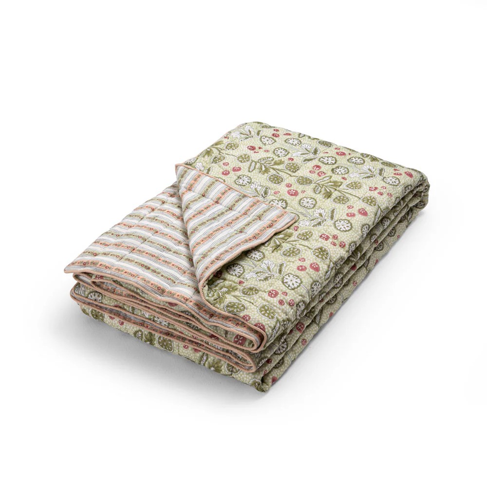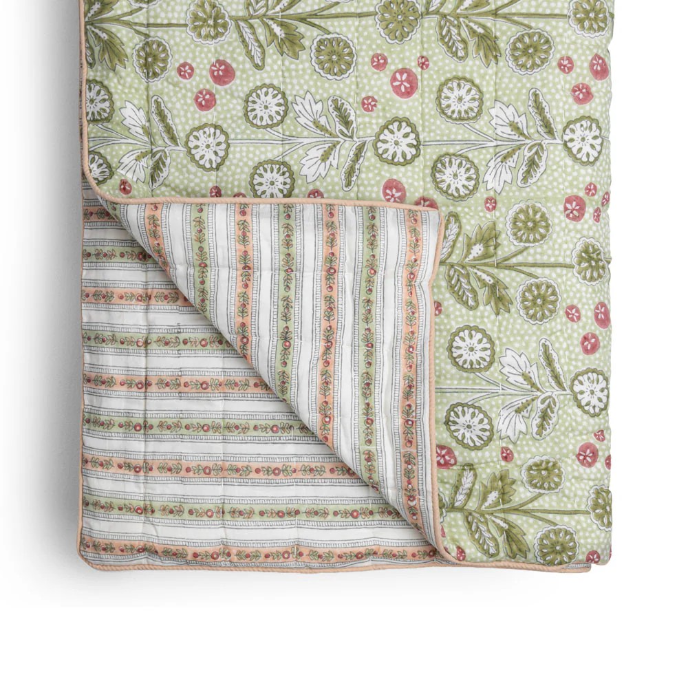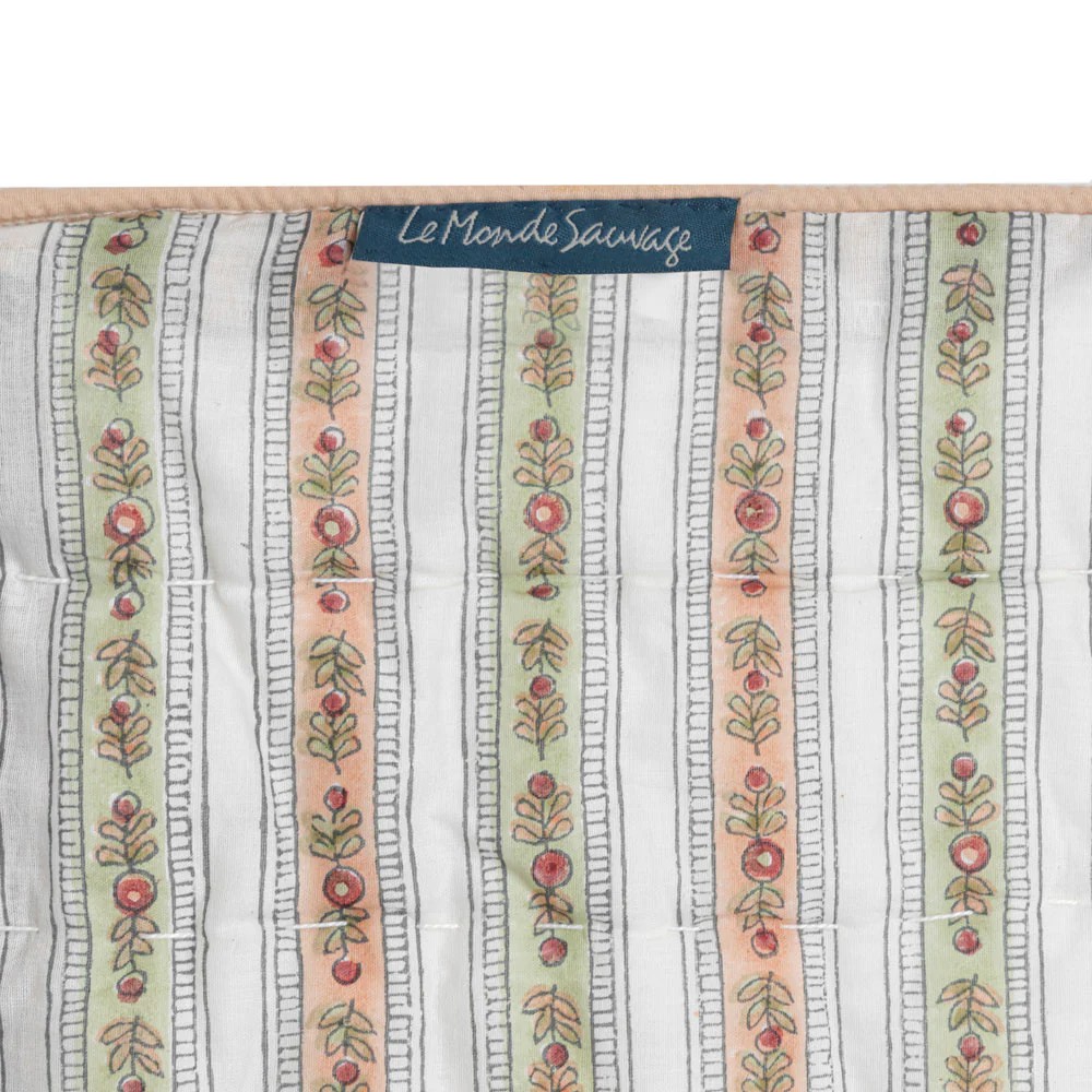 Couvre-lit une place ou jeté de canapé en coton matelassé, le Cosmique marie deux imprimés avec candeur. Réversible, il est imprimé de rayures fleuries d’un côté et d’un imprimé Liberty de l’autre.