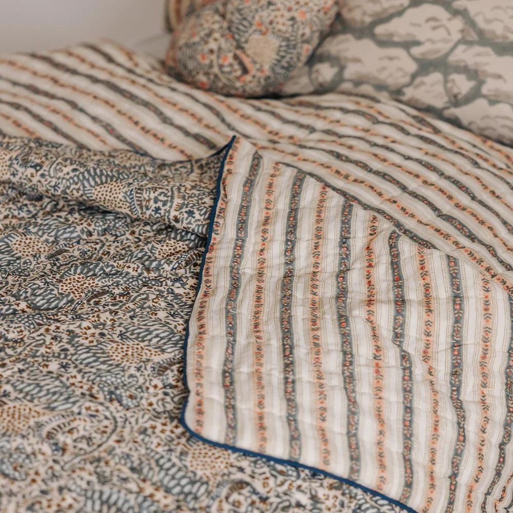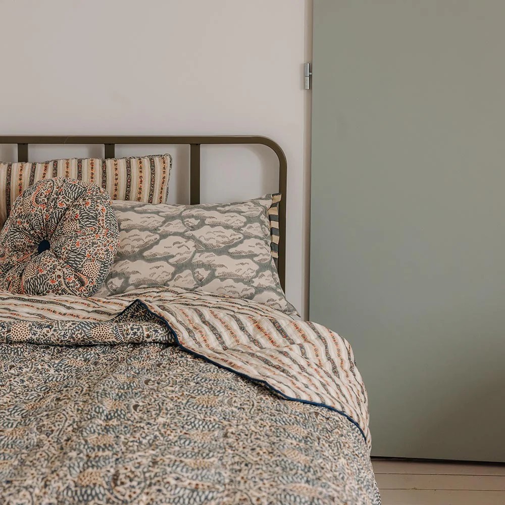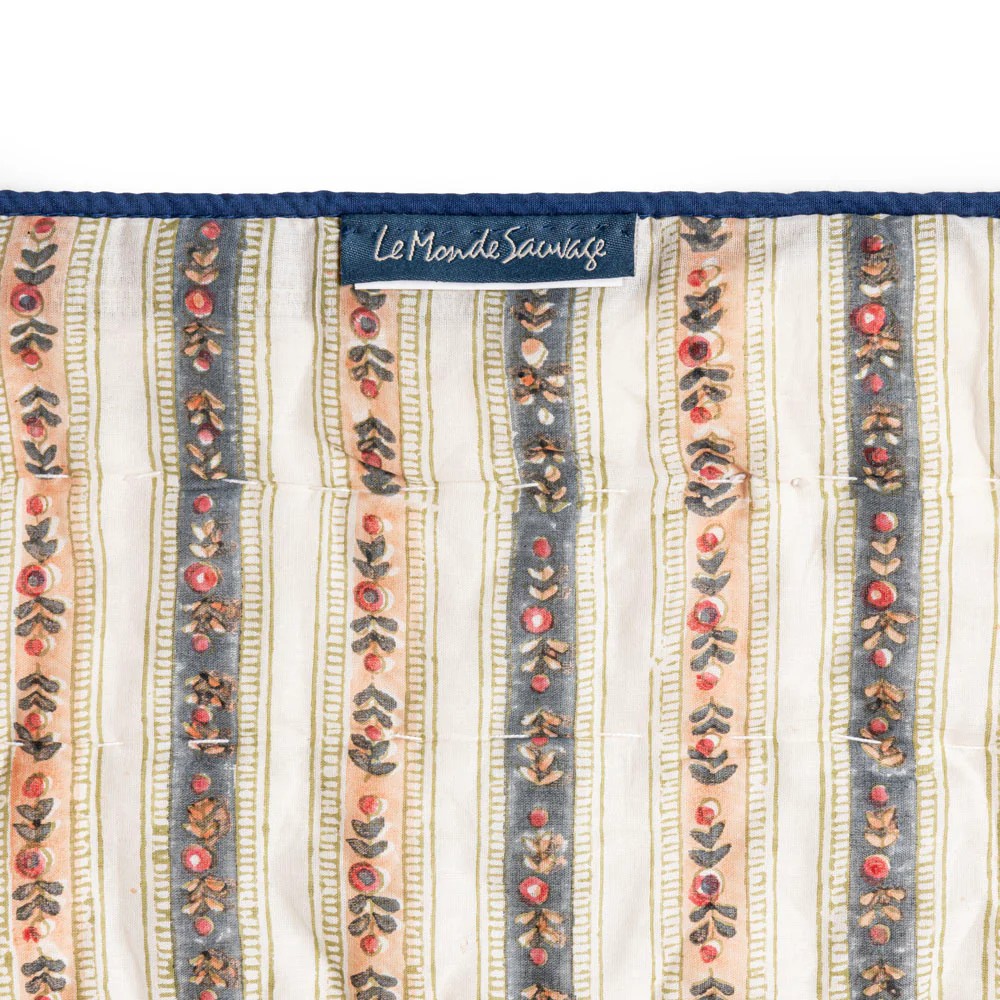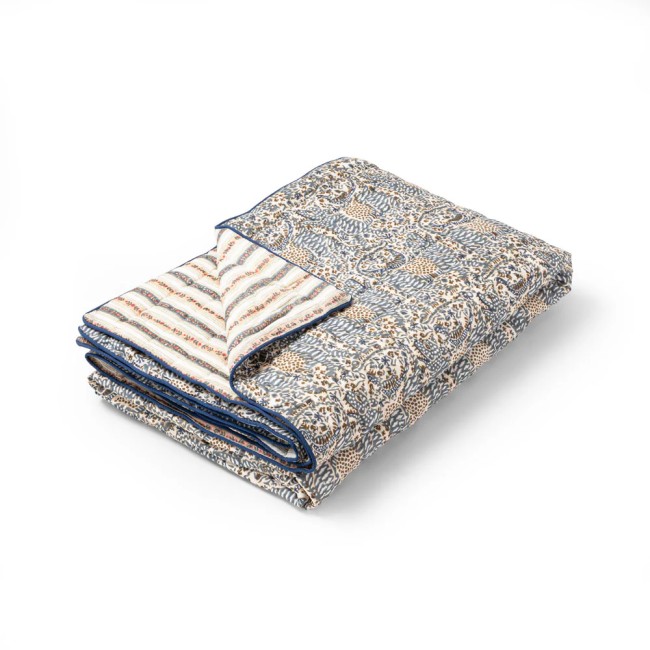 Couvre-lit une place ou jeté de canapé en coton matelassé, le Cosmique marie deux imprimés avec candeur. Réversible, il est imprimé de rayures fleuries d’un côté et d’un imprimé Liberty de l’autre.