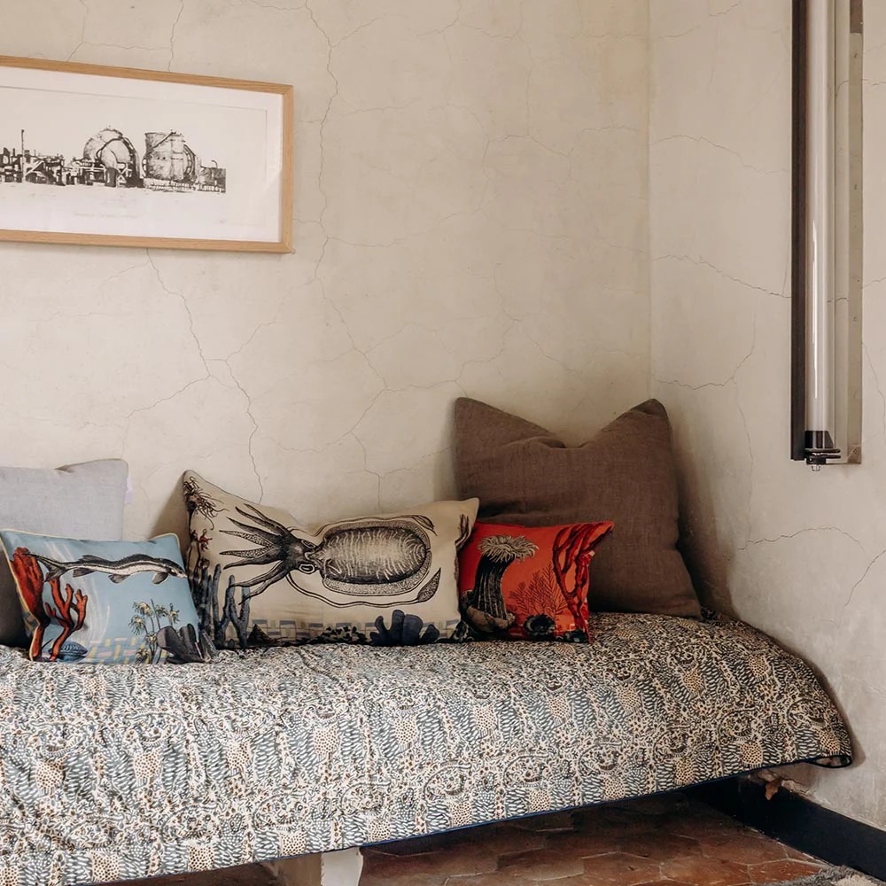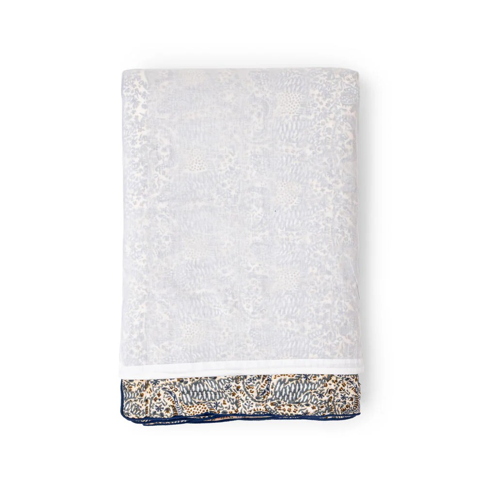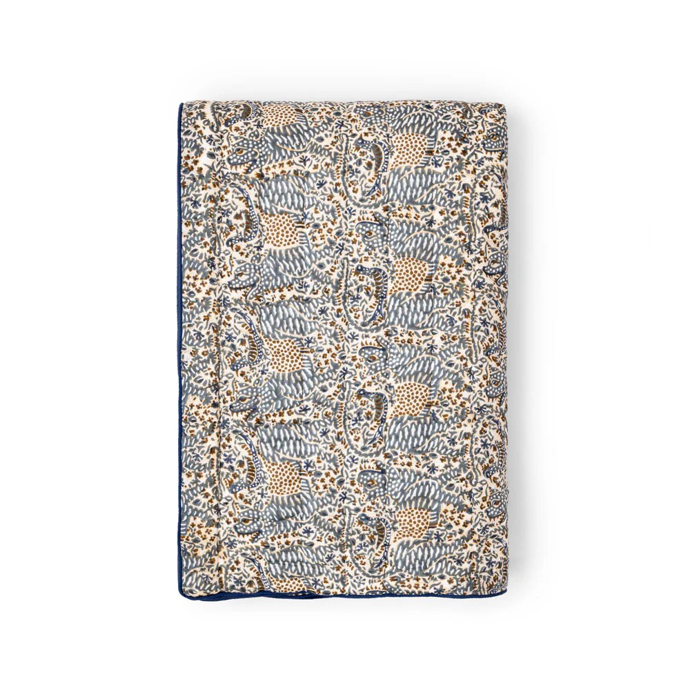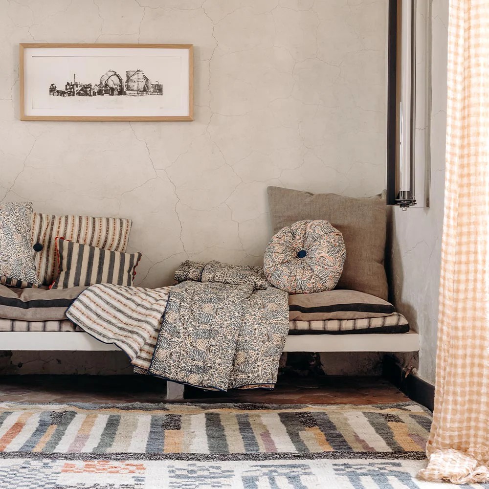 Couvre-lit une place ou jeté de canapé en coton matelassé, le Cosmique marie deux imprimés avec candeur. Réversible, il est imprimé de rayures fleuries d’un côté et d’un imprimé Liberty de l’autre.