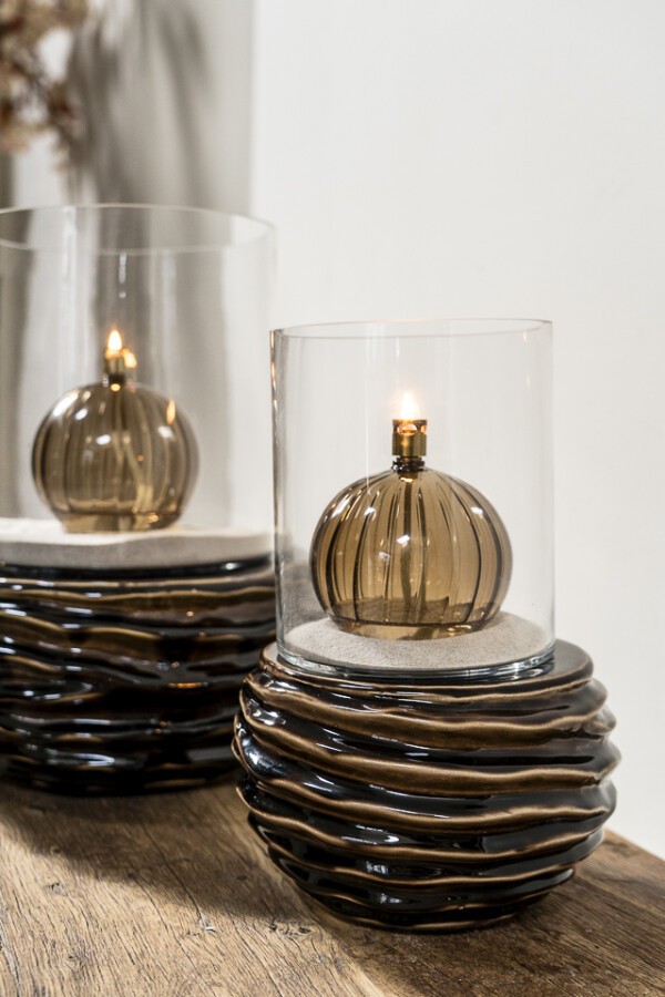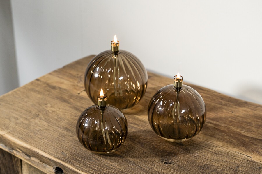 La lampe à huile ronde et élégante en verre couleur champagne de Peri Living est une lampe compacte aux tons chauds, ornée d'un élégant porte-mèche en laiton. Son design arrondi et raffiné capte la lumière en douceur et crée une ambiance chaleureuse qui invite à la détente.