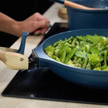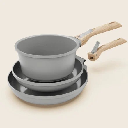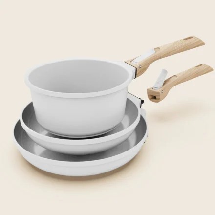 Ce pack contient une casserole 20 cm, une poêle 24 cm, une poêle 28 cm, 2 poignées amovibles et 2 feutrines de protection.