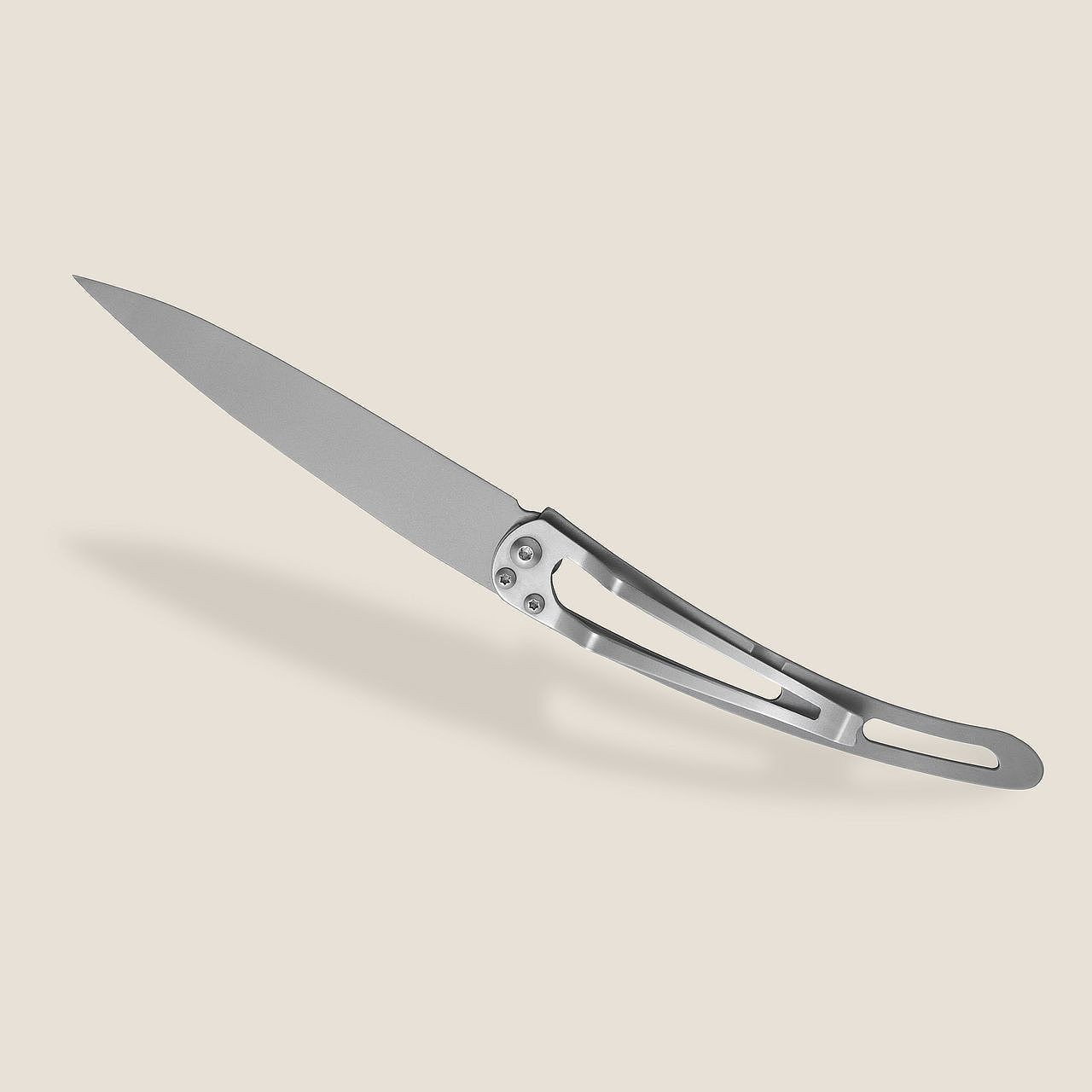 Couteau ultra léger en acier inoxydable Z40C13, finition titane gris. Lame avec cran de sécurité de type 'liner lock' décorée d'une fine gravure au laser. Clip de ceinture.