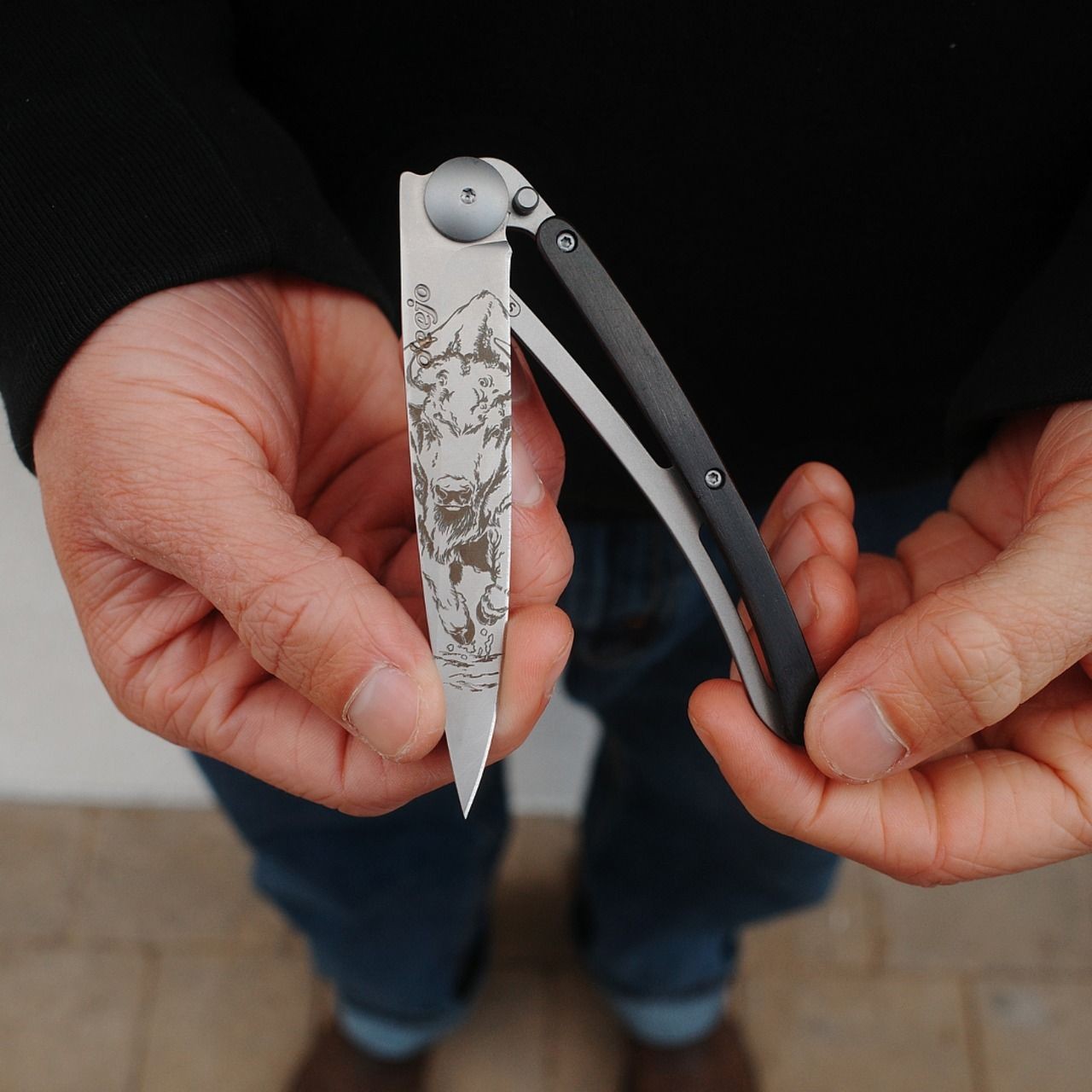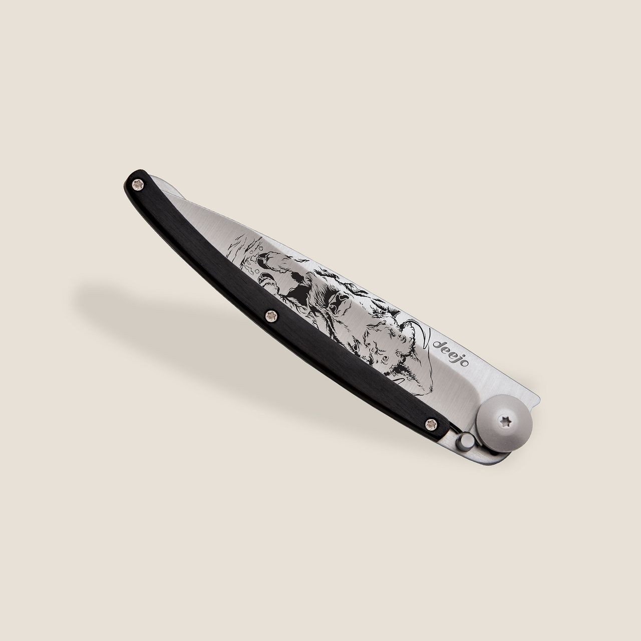 Le bois d’ébène qui orne le manche de ce couteau Deejo est une véritable ode aux noirs profonds. Cette essence de bois exceptionnelle a la particularité d'être pratiquement insensible à l’humidité ambiante. Elle s’avère ainsi être ainsi la plus dense, la plus résistante et la plus précieuse qui soit, idéale pour cette magnifique pièce de coutellerie.