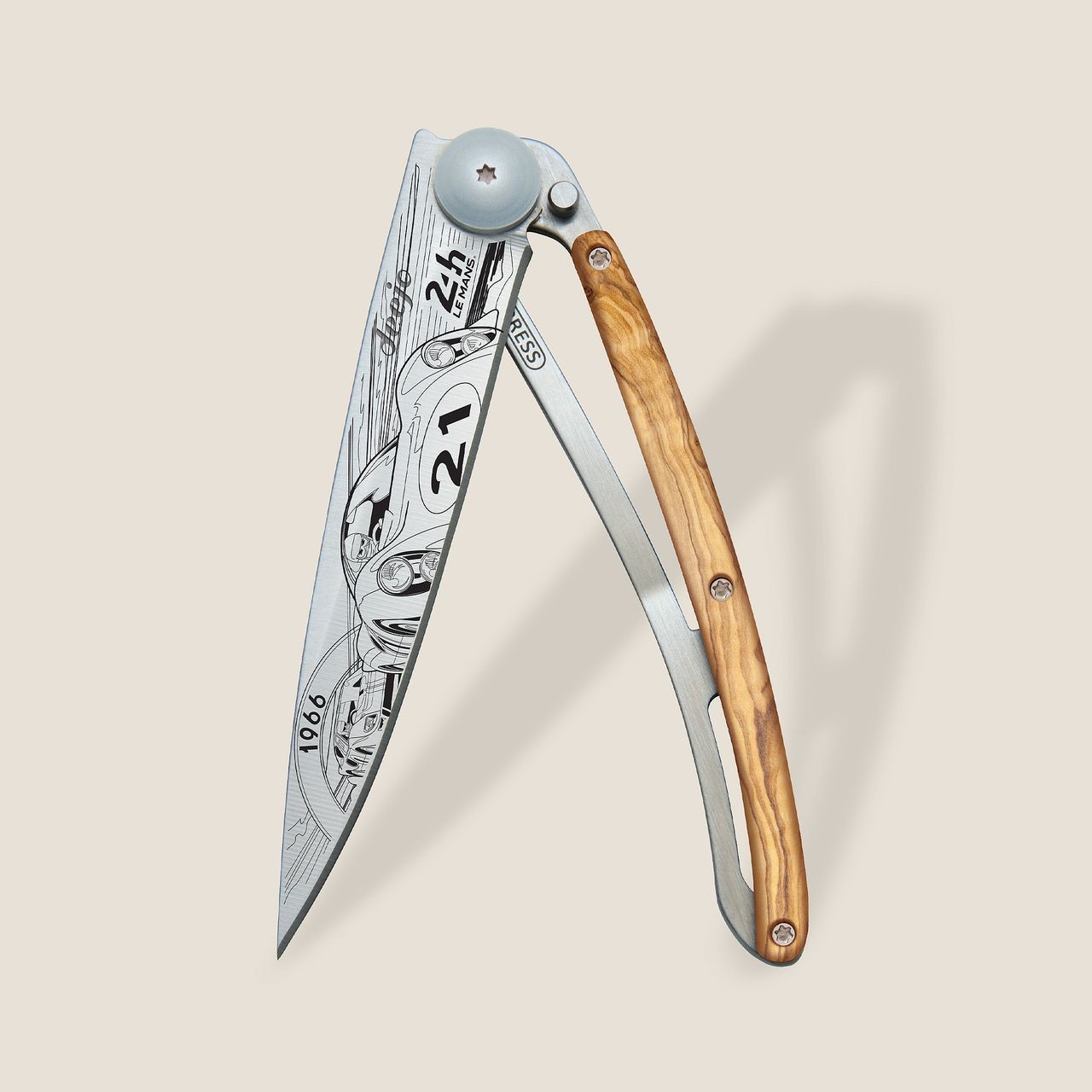 Couteau ultra léger en acier inoxydable Z40C13, finition titane gris. Lame avec cran de sécurité de type 'liner lock' décorée d'une fine gravure au laser. Clip de ceinture. Manche en Olivier.