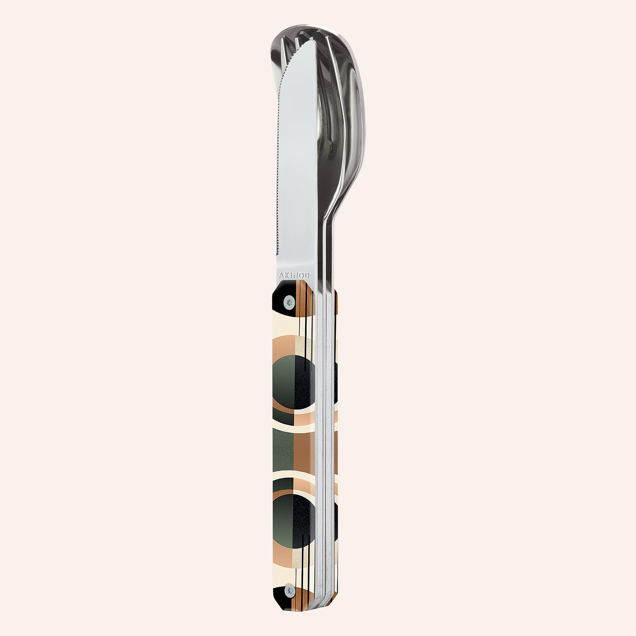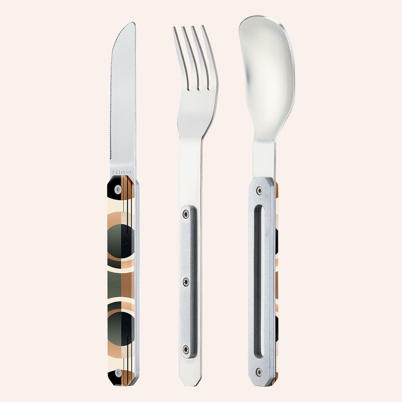 Couverts en acier inoxydable martensitique 2CR14, finition poli miroir. Composé d’une grande cuillère, d’une fourchette 4 dents et d’un couteau à lame micro dentée. Manche en polymère (PC) transparent décoré. Assemblage aimanté.