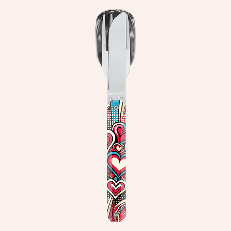 Couverts en acier inoxydable martensitique 2CR14, finition poli miroir. Composé d’une grande cuillère, d’une fourchette 4 dents et d’un couteau à lame micro dentée. Manche en polymère (PC) transparent décoré. Assemblage aimanté.