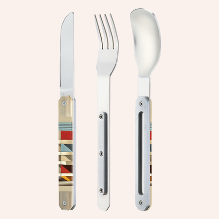 Couverts en acier inoxydable martensitique 2CR14, finition poli miroir. Composé d’une grande cuillère, d’une fourchette 4 dents et d’un couteau à lame micro dentée. Manche en polymère (PC) transparent décoré. Assemblage aimanté.