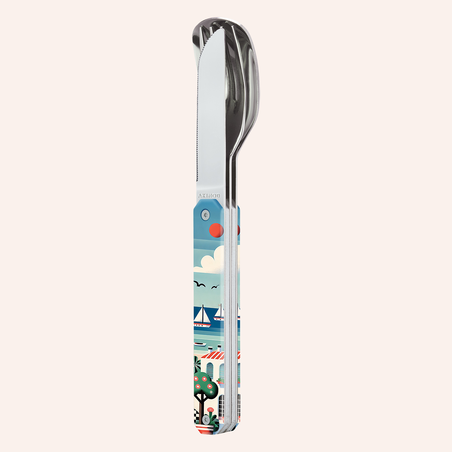 Couverts en acier inoxydable martensitique 2CR14, finition poli miroir. Composé d’une grande cuillère, d’une fourchette 4 dents et d’un couteau à lame micro dentée. Manche en polymère (PC) transparent décoré. Assemblage aimanté.