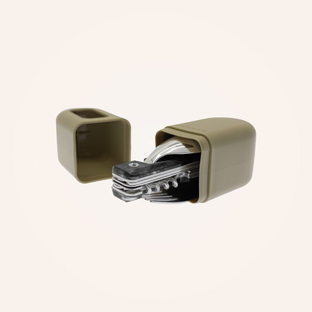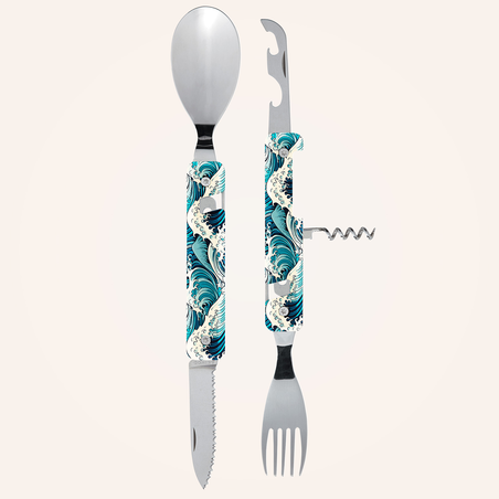 Couverts multifonctions en acier inoxydable martensitique 2CR14, finition poli miroir. Composé d’une grande cuillère, d’une fourchette 5 dents, d’un couteau à lame micro dentée, d’un tire-bouchon 4 spirales, d’un outre boîte et d’un décapsuleur. Manche en polymère (PC) transparent décoré. Assemblage aimanté. Livré avec étui de transport en polypropylène rigide (PP).