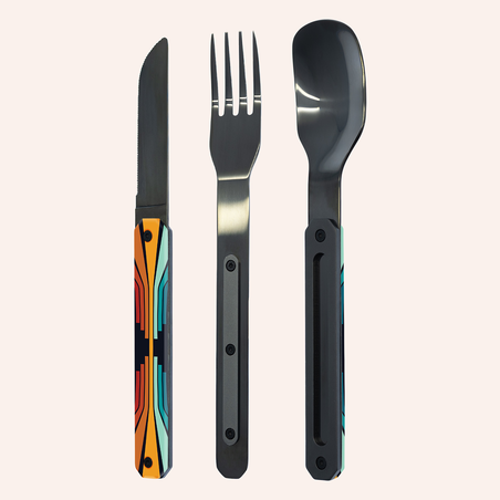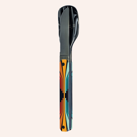 Couverts en acier inoxydable martensitique 2CR14, finition poli miroir. Composé d’une grande cuillère, d’une fourchette 4 dents et d’un couteau à lame micro dentée. Manche en polymère (PC) transparent décoré. Assemblage aimanté.