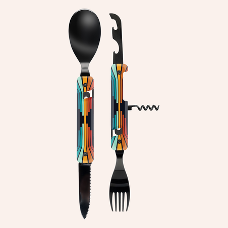 Couverts multifonctions en acier inoxydable martensitique 2CR14, finition poli miroir. Composé d’une grande cuillère, d’une fourchette 5 dents, d’un couteau à lame micro dentée, d’un tire-bouchon 4 spirales, d’un outre boîte et d’un décapsuleur. Manche en polymère (PC) transparent décoré. Assemblage aimanté. Livré avec étui de transport en polypropylène rigide (PP).