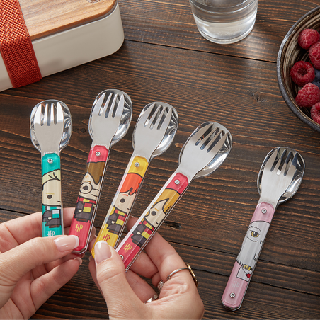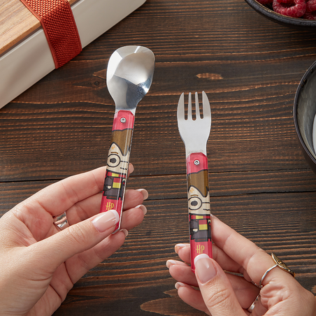 Couverts en acier inoxydable martensitique 2CR14, finition poli miroir. Composé d’une cuillère et d’une fourchette 4 dents. Manche en polymère (PC) transparent décoré. Assemblage aimanté. Livré avec étui de transport en polypropylène rigide (PP). Compatible lave-vaisselle.