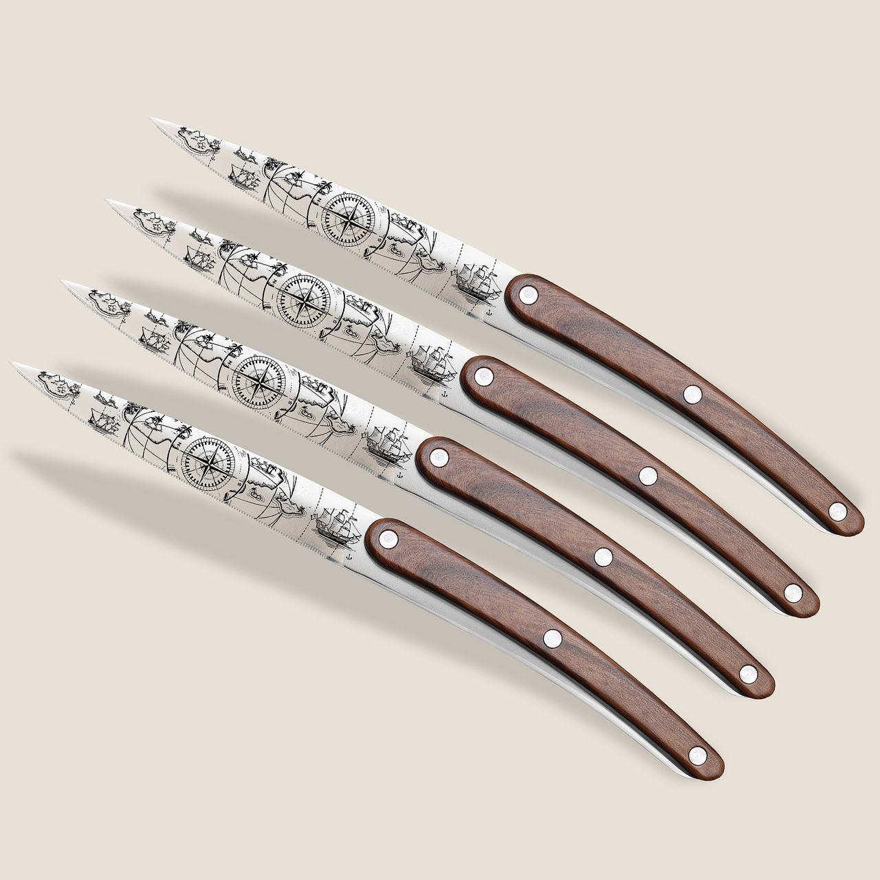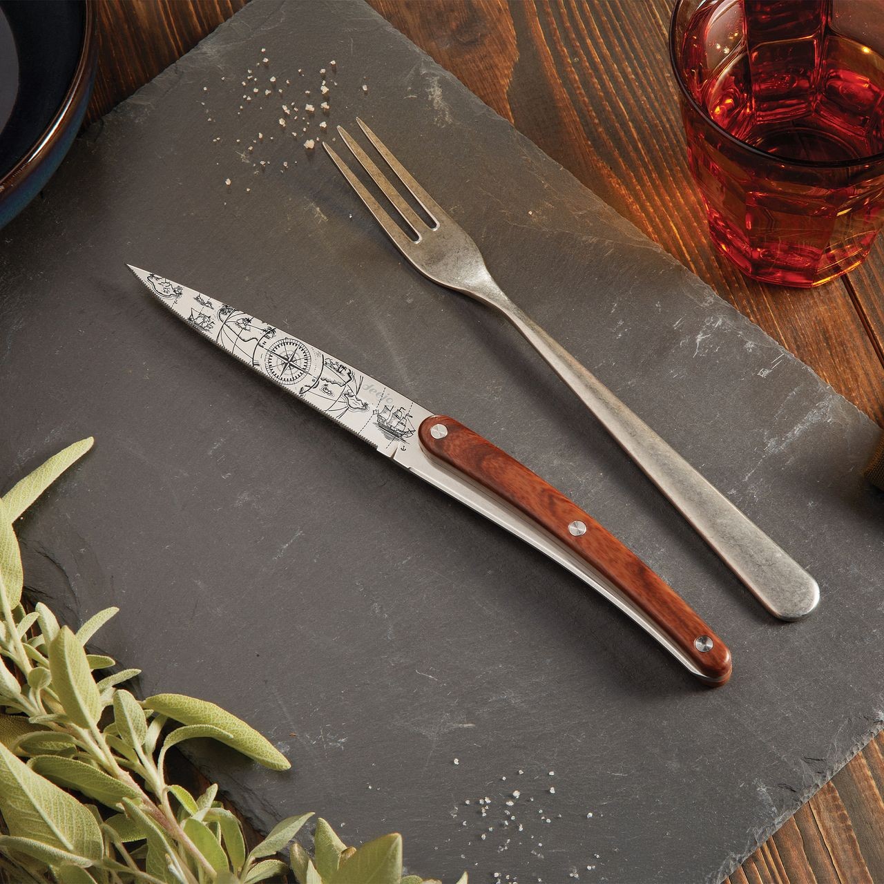 Inspirés par le motif Saporem Mundi, hommage aux saveurs lointaines, ces couteaux étincelants associent lignes épurées et manche façon palissandre aux reflets ambrés. Leur élégance durable s’accompagne d’un entretien simplifié : compatibles lave-vaisselle et jamais à affûter.