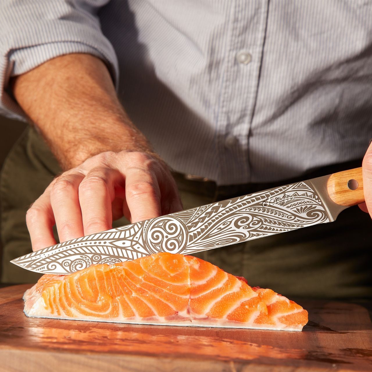 Une fine lame redoutable à la géométrie symbolique pour inspirer des coupes longues, régulières et des saveurs au cordeau.