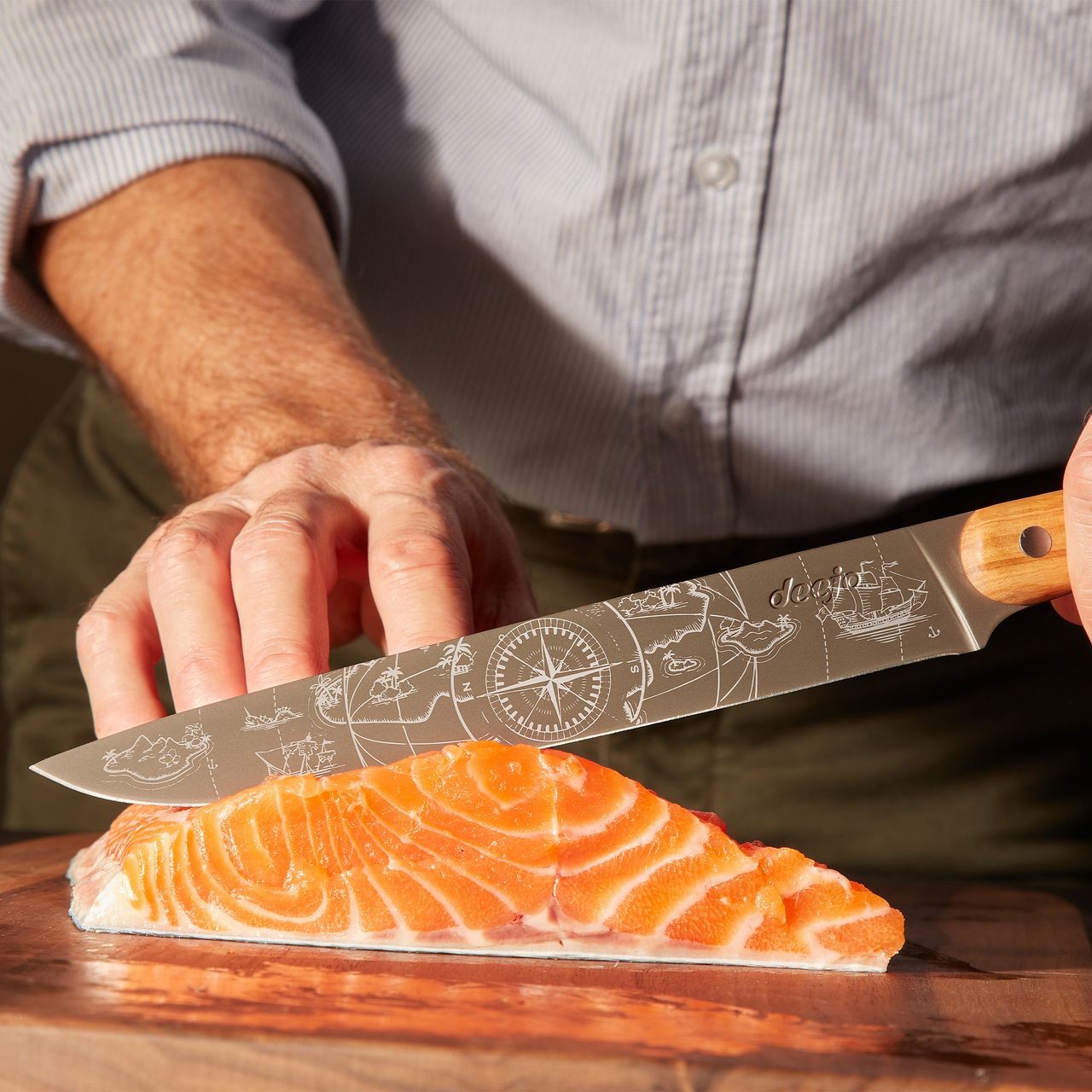 Couteau de cuisine pleine soie. Lame en acier inoxydable X50CRMOV15 décoré d'une fine gravure au laser. Finition en titane gris anthracite. Manche en bois d'olivier riveté.