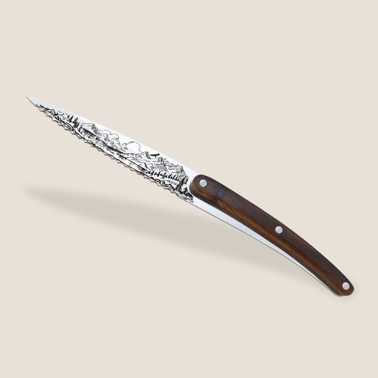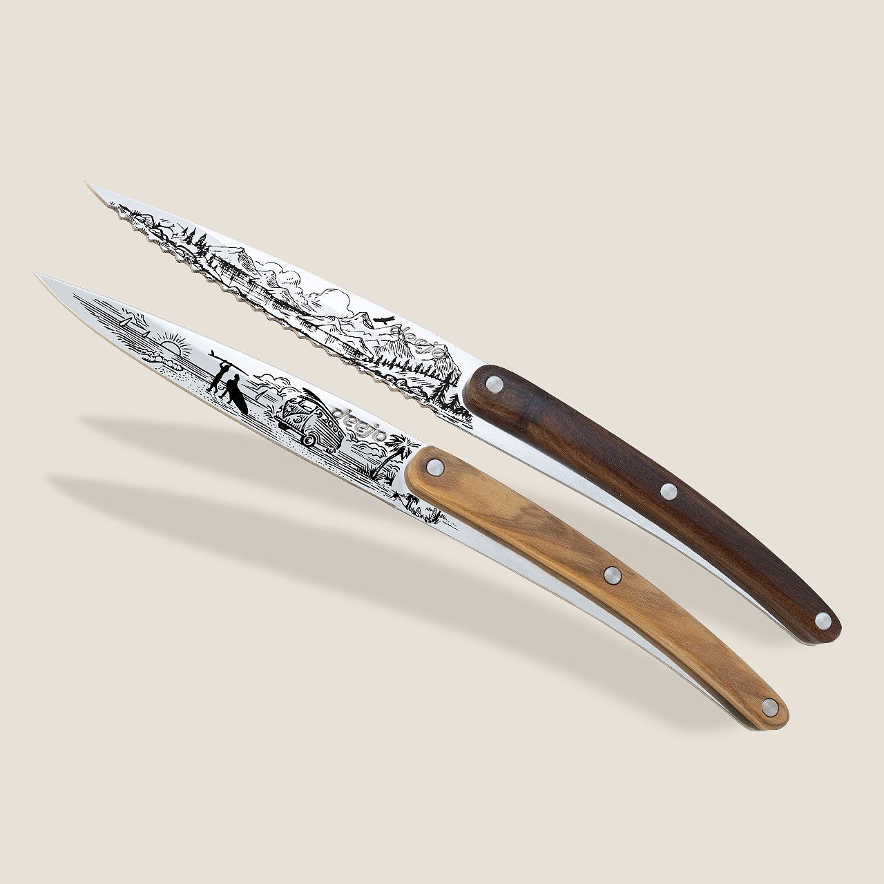 Ensemble de 2 couteaux d'office à lame fixe (non pliant) en acier inoxydable 2CR14, finition miroir. Affutage rasoir et lame micro dentée pour l’autre. Manche en Olivier et Bois Corail.