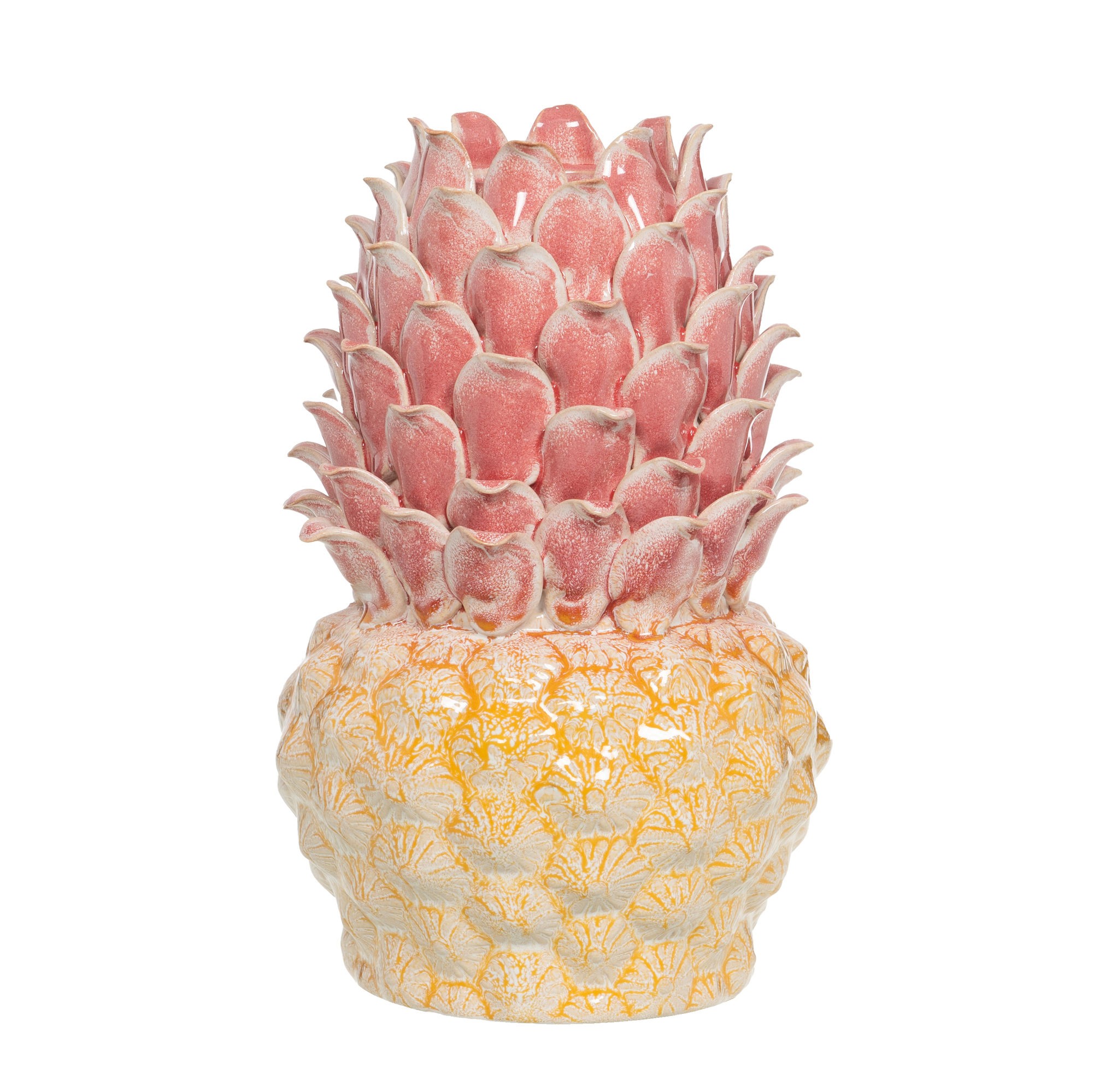 Forme inspirée d’un ananas stylisé avec un fini émaillé bicolore apportant relief et texture visuelle.