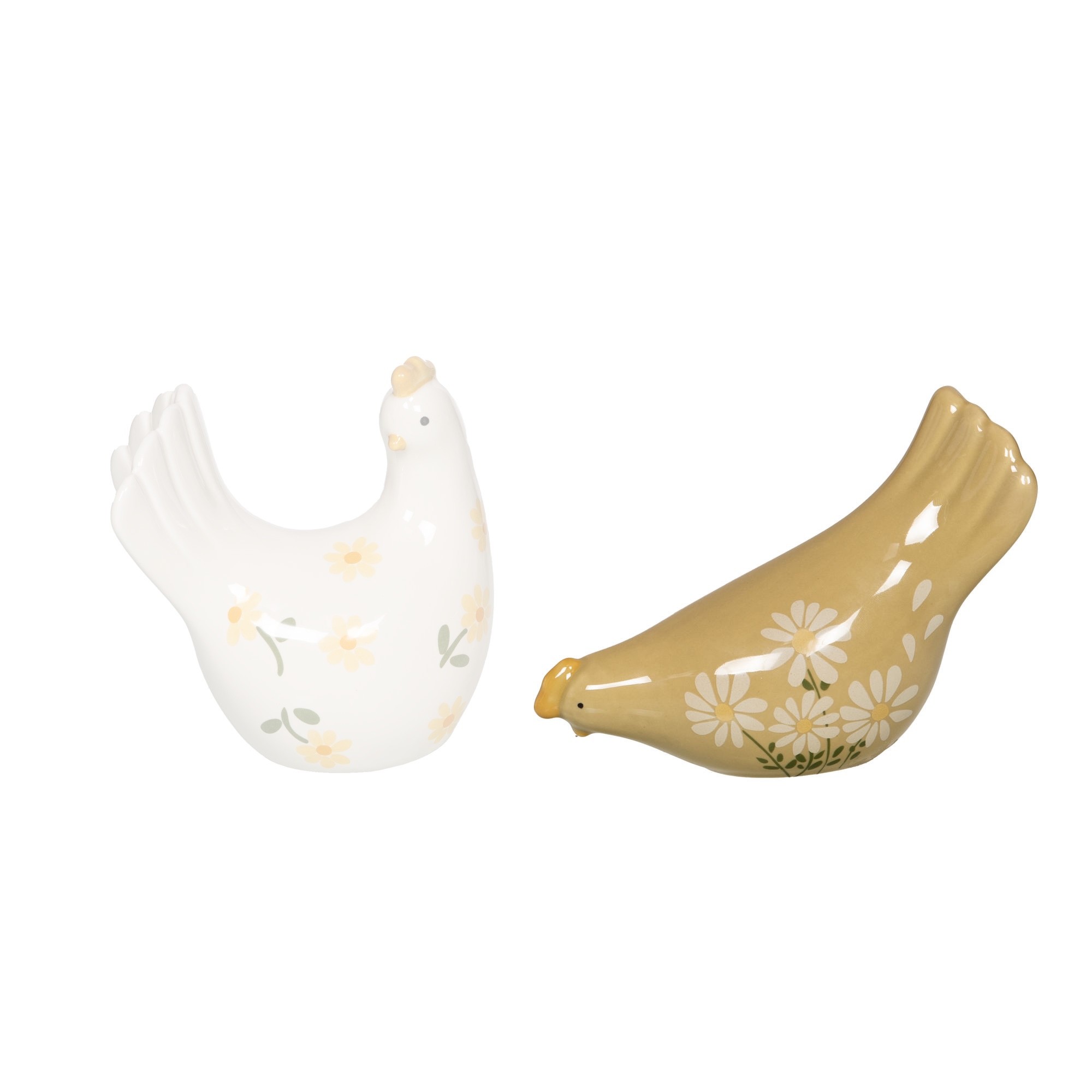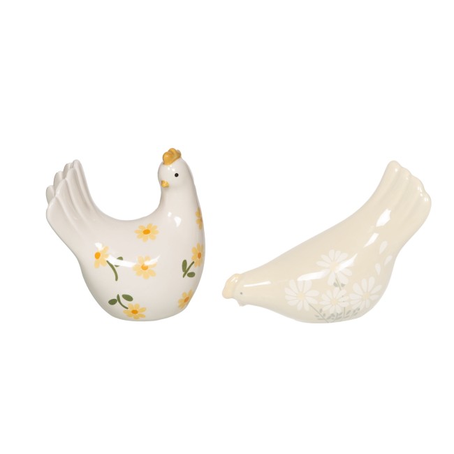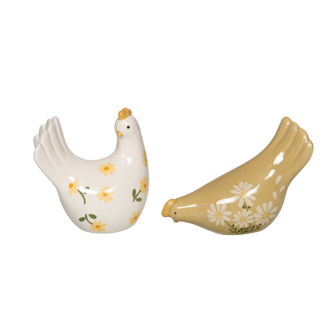 Figurine décorative "Poule Daisy" en céramique, présentée en assortiment de deux modèles aux motifs floraux.