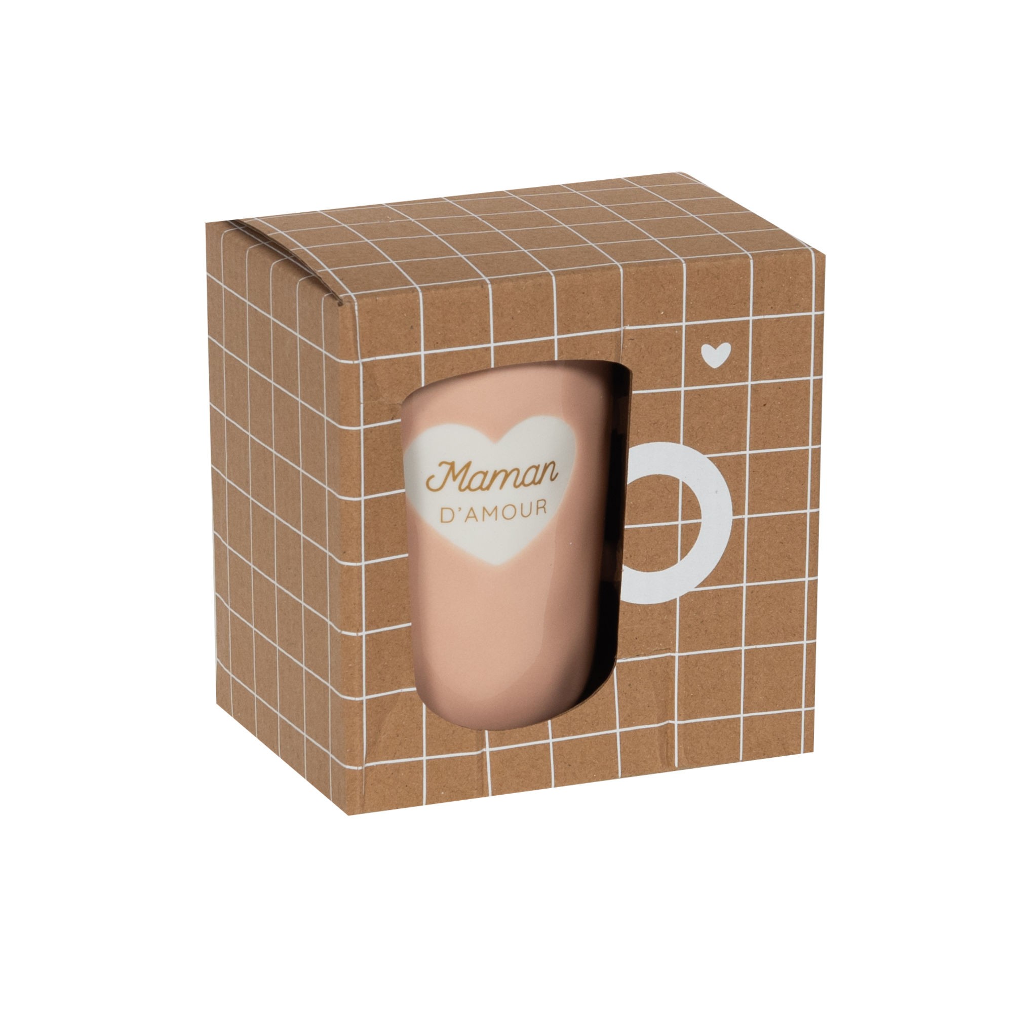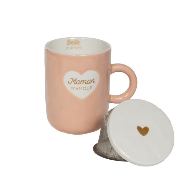 Format pratique (H 11 cm, Ø env. 8 cm) avec anse confortable et couvercle filtrant pour infusion individuelle. Apparence glaçurée couleur pêche/rose poudré avec motif cœur et inscription dorée.