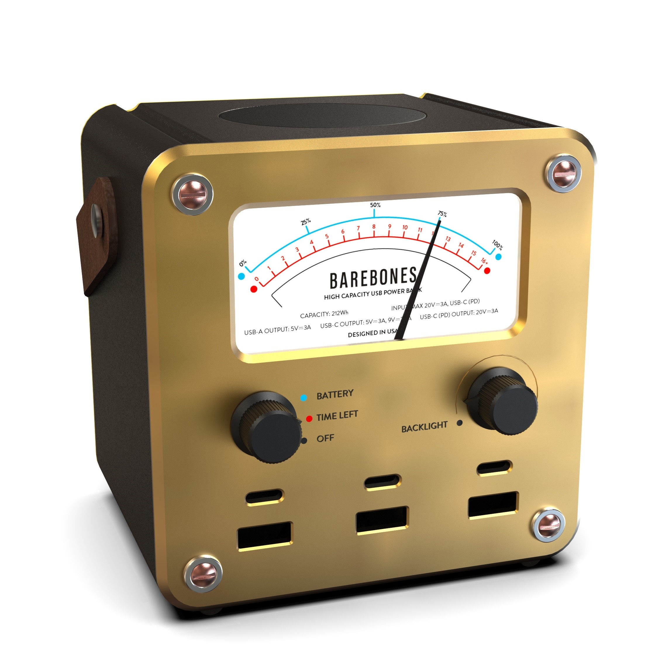• Affichage analogique d'inspiration vintage indiquant le niveau de batterie ou la puissance d'entrée/sortie (Watts)