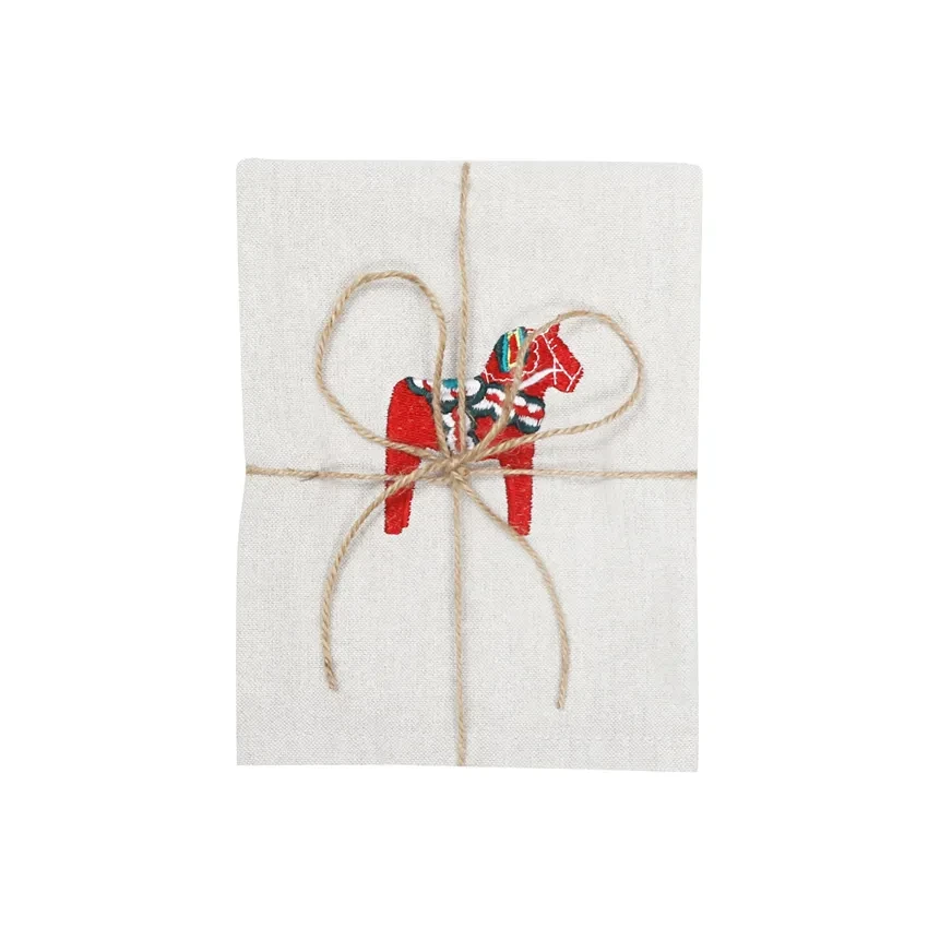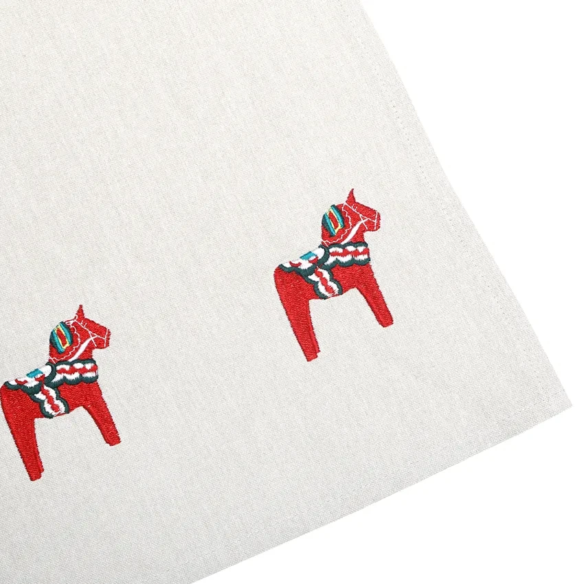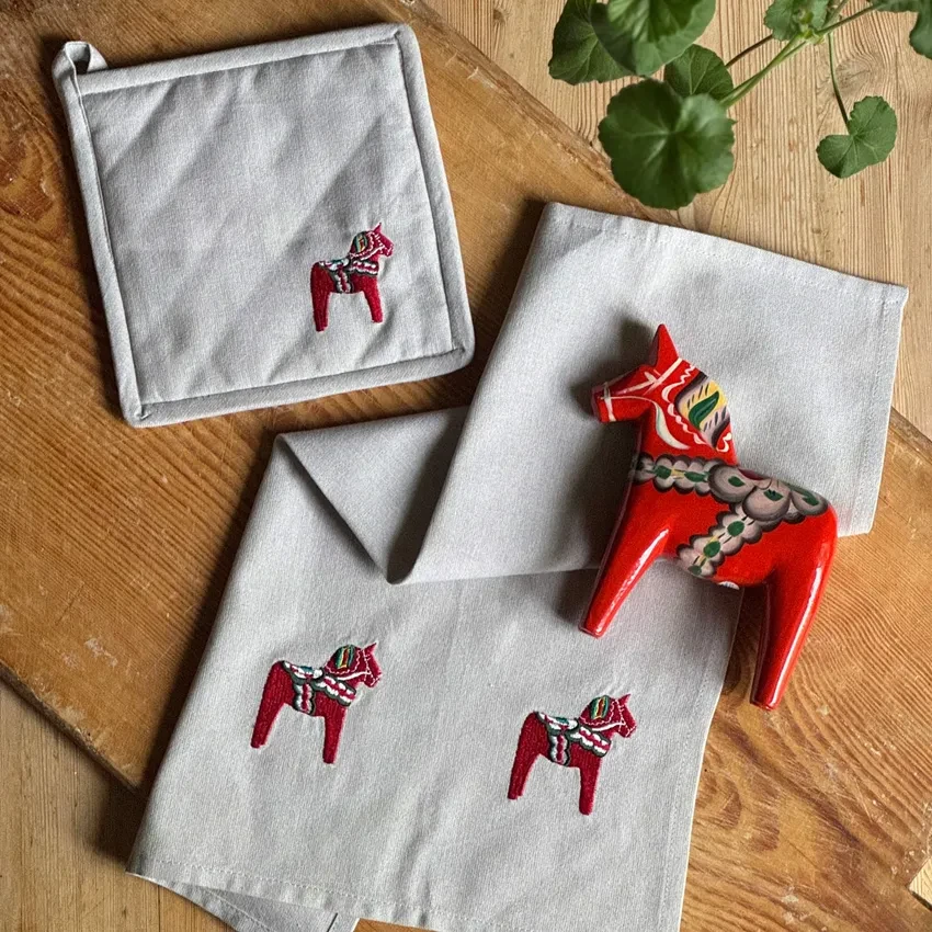 Torchon traditionnel orné de chevaux de Dalécarlie brodés. Ce motif est brodé sur ces torchons de la marque Recycled by Wille, parfaits pour une décoration champêtre. Fabriqués à partir de 99 % de tissu recyclé, ils sont confectionnés grâce aux chutes de tissu issues de la production d'environ 35 t-shirts. Soucieux du bien-être des personnes et de l'environnement, nous créons de magnifiques accessoires de décoration pour votre intérieur.
