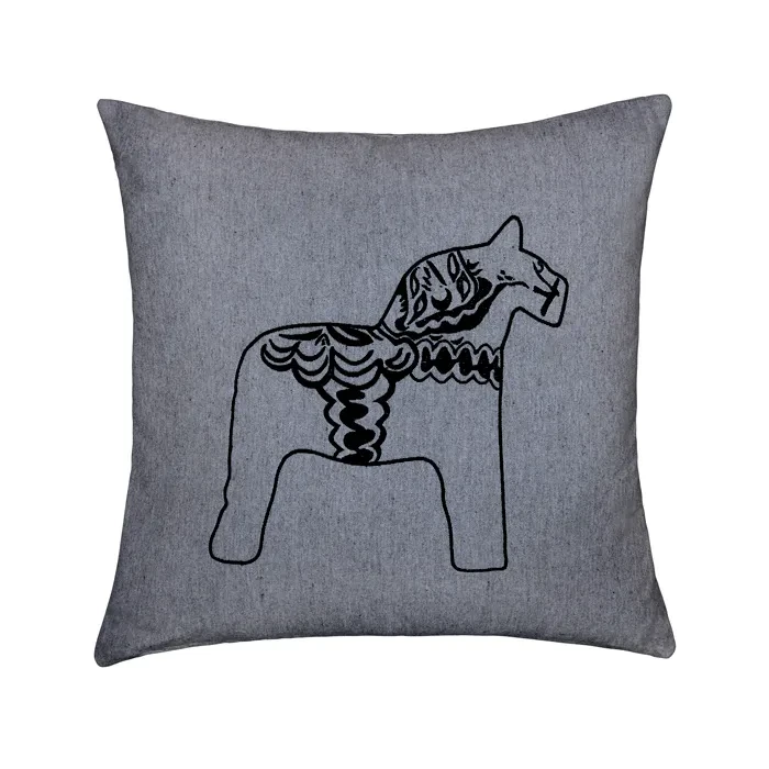 Coussin gris traditionnelle pour canapé, fauteuil ou lit, ornée d'une broderie représentant un cheval dalá typiquement suédois, en noir ou rouge. Idéale pour une maison de campagne ou une résidence secondaire, cette housse est confectionnée à partir de 99 % de textile recyclé, dans le but de minimiser son impact environnemental. Décorez votre intérieur tout en préservant l'environnement et en protégeant les personnes.