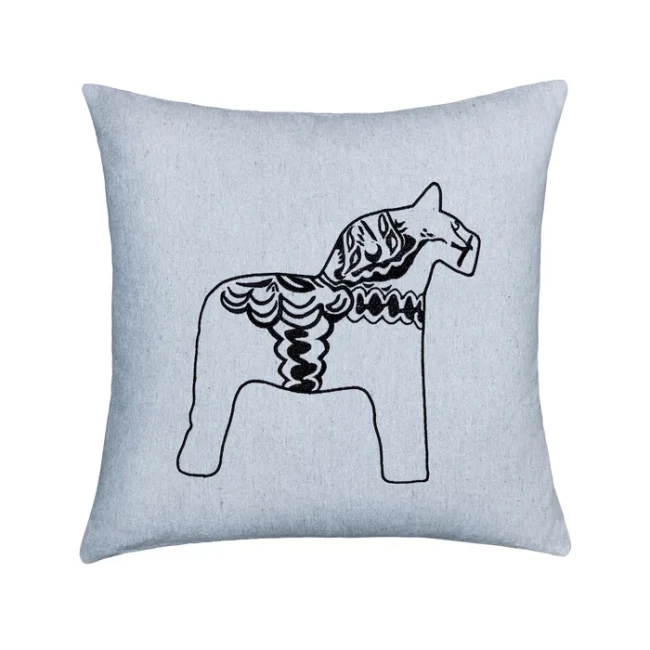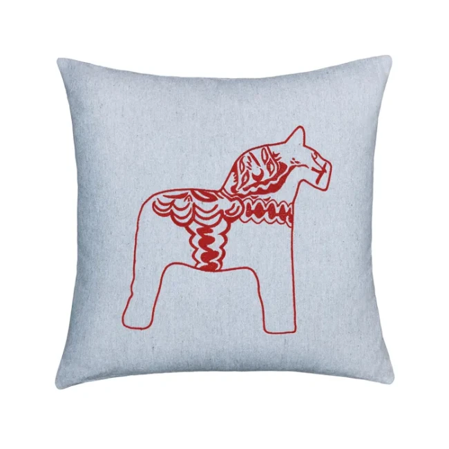 Coussin gris traditionnelle pour canapé, fauteuil ou lit, ornée d'une broderie représentant un cheval dalá typiquement suédois, en noir ou rouge. Idéale pour une maison de campagne ou une résidence secondaire, cette housse est confectionnée à partir de 99 % de textile recyclé, dans le but de minimiser son impact environnemental. Décorez votre intérieur tout en préservant l'environnement et en protégeant les personnes.