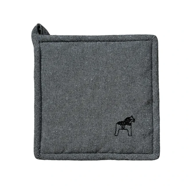 Manique simple et unie, ornée d'une broderie représentant un petit cheval de Dalécarlie, motif typiquement suédois, idéale pour une maison de campagne. Fabriquée à 99 % à partir de textile recyclé, elle a été conçue pour minimiser son impact environnemental. Apportez une touche de confort à votre cuisine tout en préservant votre santé et l'environnement.