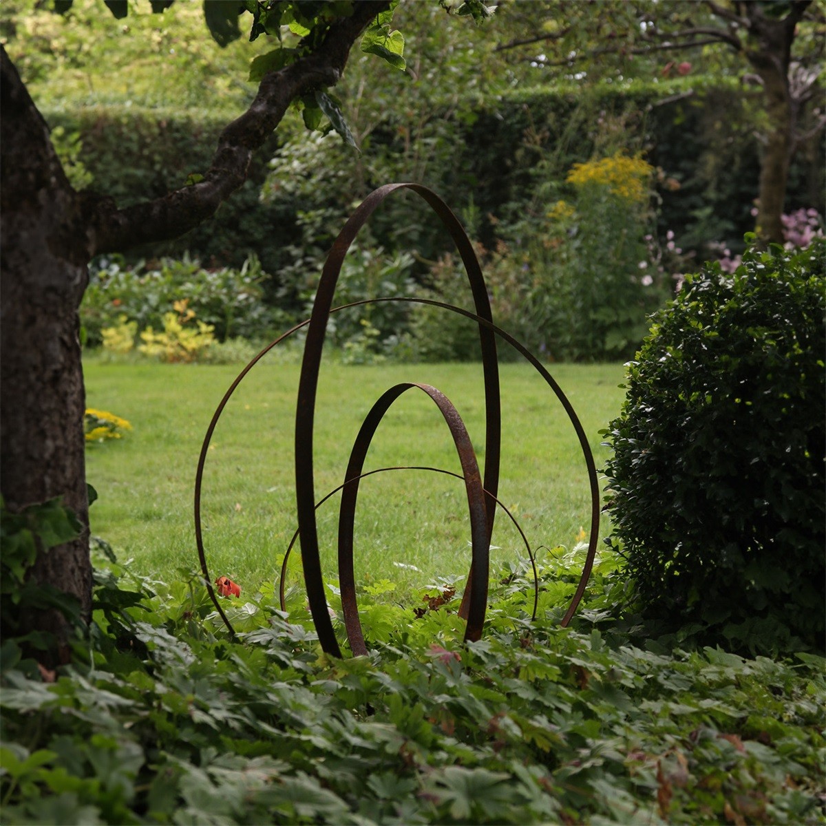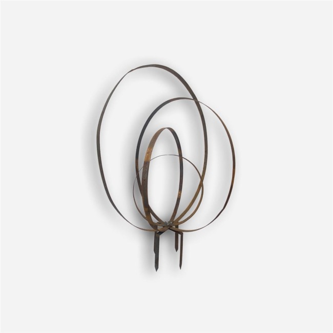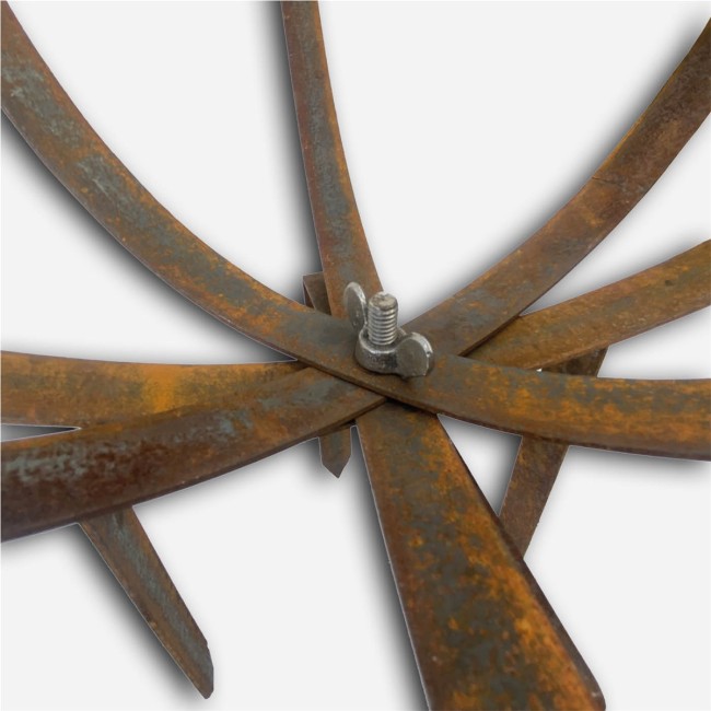 Ce support pour plantes se compose de quatre anneaux en fer plat et robuste qui se déplient facilement pour former une boule décorative.