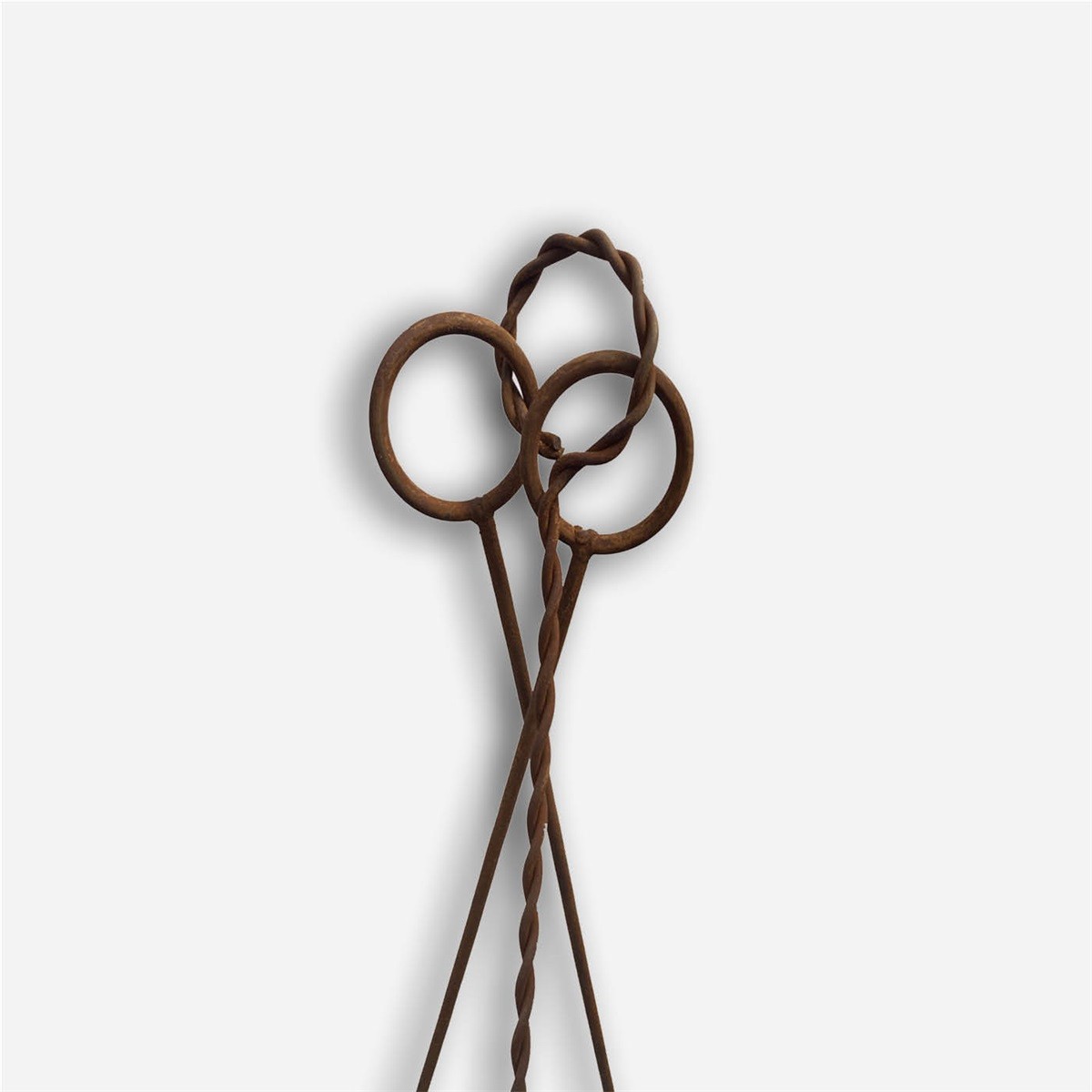 Ce support à plantes élégant possède trois pieds et un design unique : l’un d’eux est élégamment torsadé pour une touche décorative.