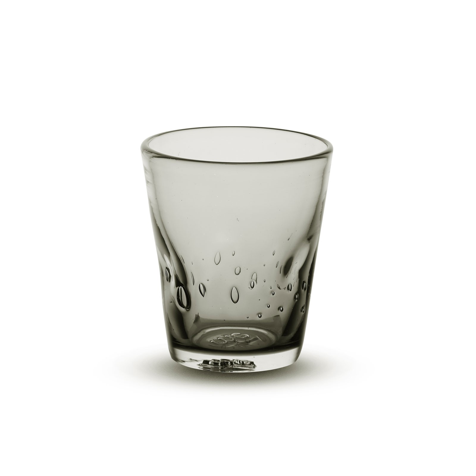 Un verre fabriqué à partir de pâte de verre soufflée à la main, puis pressé à chaud pour obtenir sa forme caractéristique.